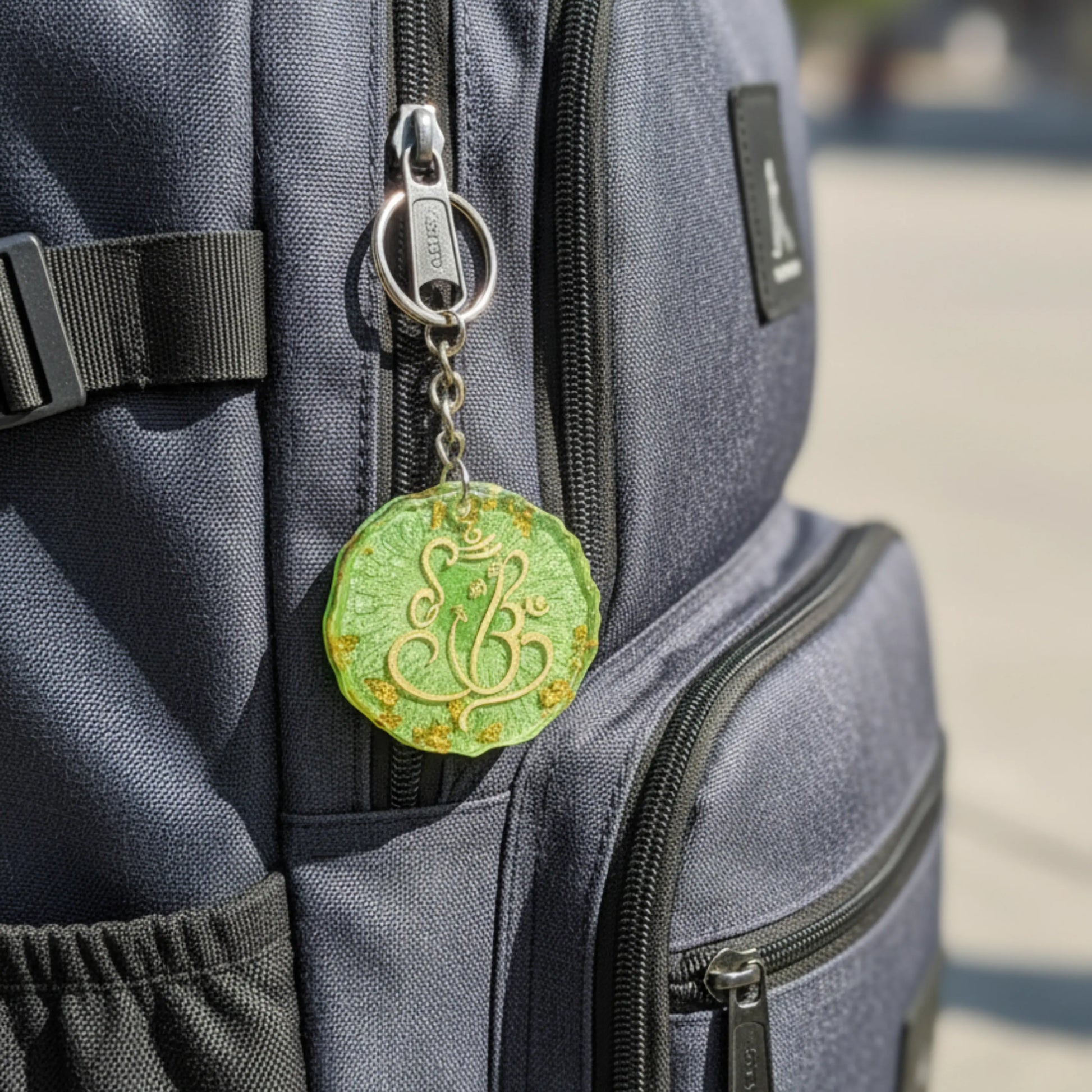 A beautifully handcrafted resin keychain featuring a detailed Ganesha idol. This vibrant, translucent green keychain with sparkling gold flakes is a modern symbol of good fortune and wisdom. Perfect for adding a touch of divine charm to your keys or bag.